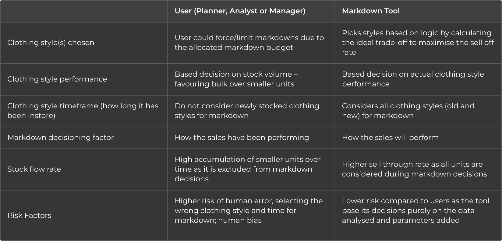 The variances between the user and MT could all be explained and therefore no risk to the business was identified if the choice was made to implement the markdown based on the tool’s results.